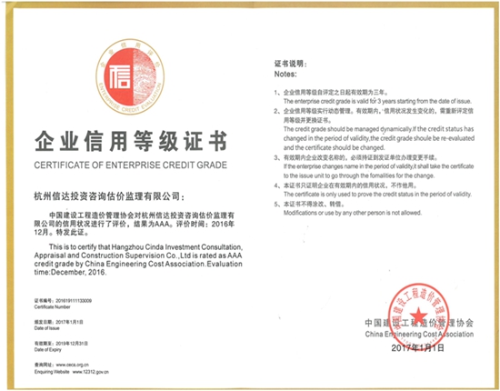 中國建設工程造價管理協會企業信用等級AAA級(2016.12 有效期三年)